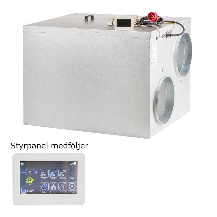 Placering sker lämpligast på vind, i förråd eller liknande utrymme. Komplett med användarvänlig styrutrustning med separat display. Ventilationsaggregatet levereras för enkel och snabb installation då eftervärmebatteri och givare finns monterade internt i aggregatet, helt klart för driftsättning via sladd med stickpropp/ anslutningshandske.
