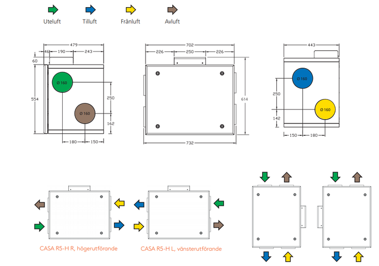 Swegon CASA R5-H är ett bostadsaggregat (702 x 614 x 479 mm, O160 mm) med roterande värmeväxlare för villor, små kontor etc. (120 l/s, 250 m2) Passar utmärkt för vindsmontage i villan då den är anpassad for att tranporteras upp genom vindsluckan. Marknadens mest intelligenta luftfuktighetsstyrning som standard. Utvecklade, tillverkade och testade för vårt nordiska klimat.